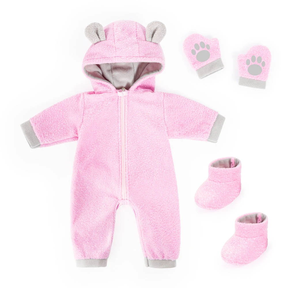 Vul de kledingkast van je pop aan met deze schattige deluxe poppenonesie. Deze fantastische poppenoutfit bestaat uit vijf delen en is ontworpen met mooie details. De prachtige set bestaat uit een pluche jumpsuit, handschoenen en schoenen. De poppenkleding heeft niet alleen een berenprint, maar houdt de pop bovendien warm. Met de rits voor de onesie is het zelfs voor kleine kinderhandjes makkelijk om hun pop aan te kleden. Dankzij deze onesie krijgt je favoriete pop dus niet alleen een individuele uitstraling, maar wordt bovendien spelenderwijs de behendigheid geoefend. De onesie is geschikt voor poppen van 38 tot 42 cm.
